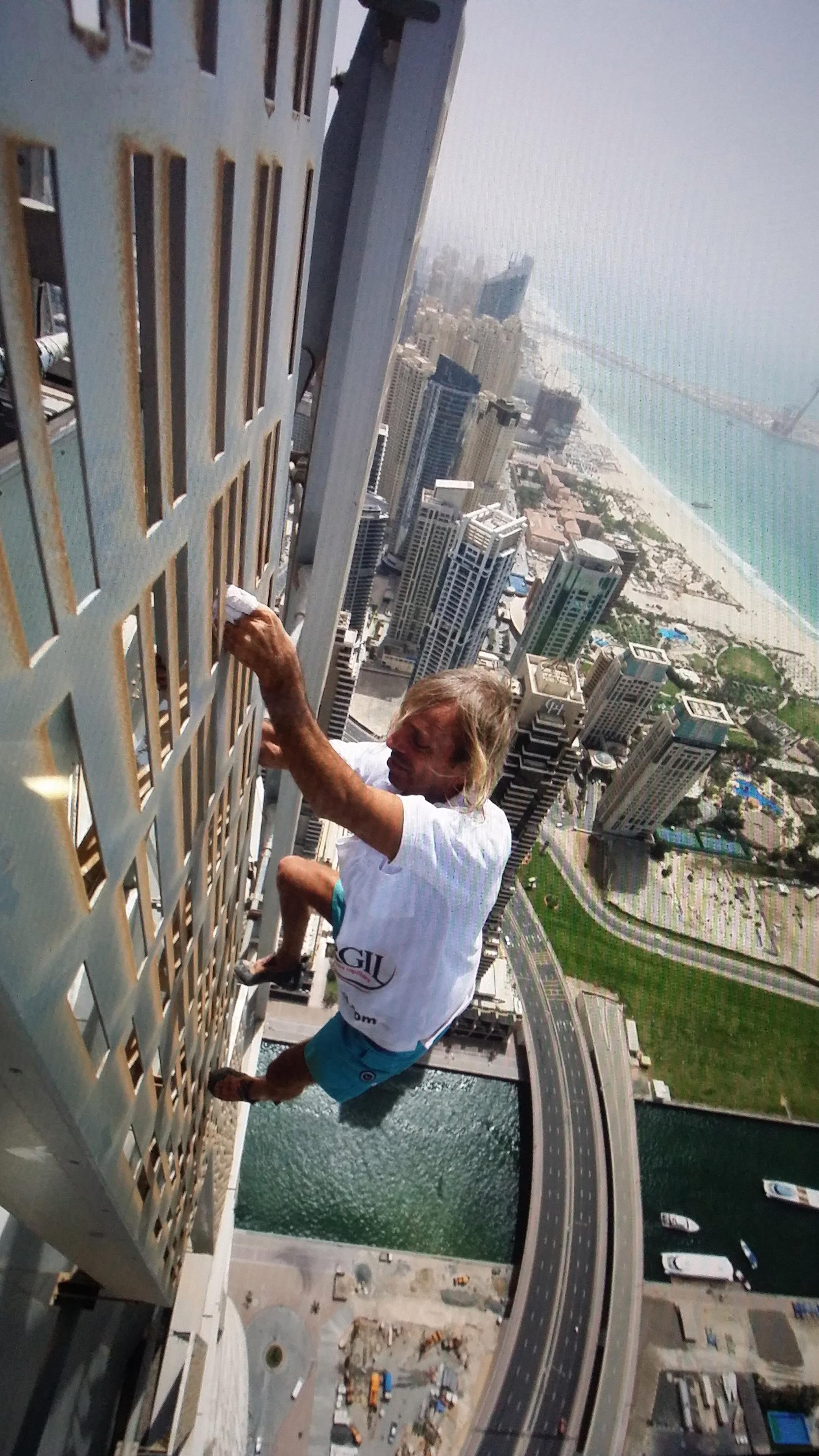 Nel febbraio del 2003 esegue un’arrampicata autorizzata lungo i 200 metri della National Bank of Abu Dhabi, negli Emirati Arabi Uniti, guardato da circa 100 000 spettatori.